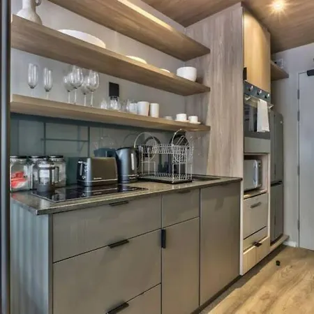 Luxury Urban Living At The Harri Apartment is equipped with a kitchen, including a toaster, a cooktop, and glassware, to ensure your comfort.